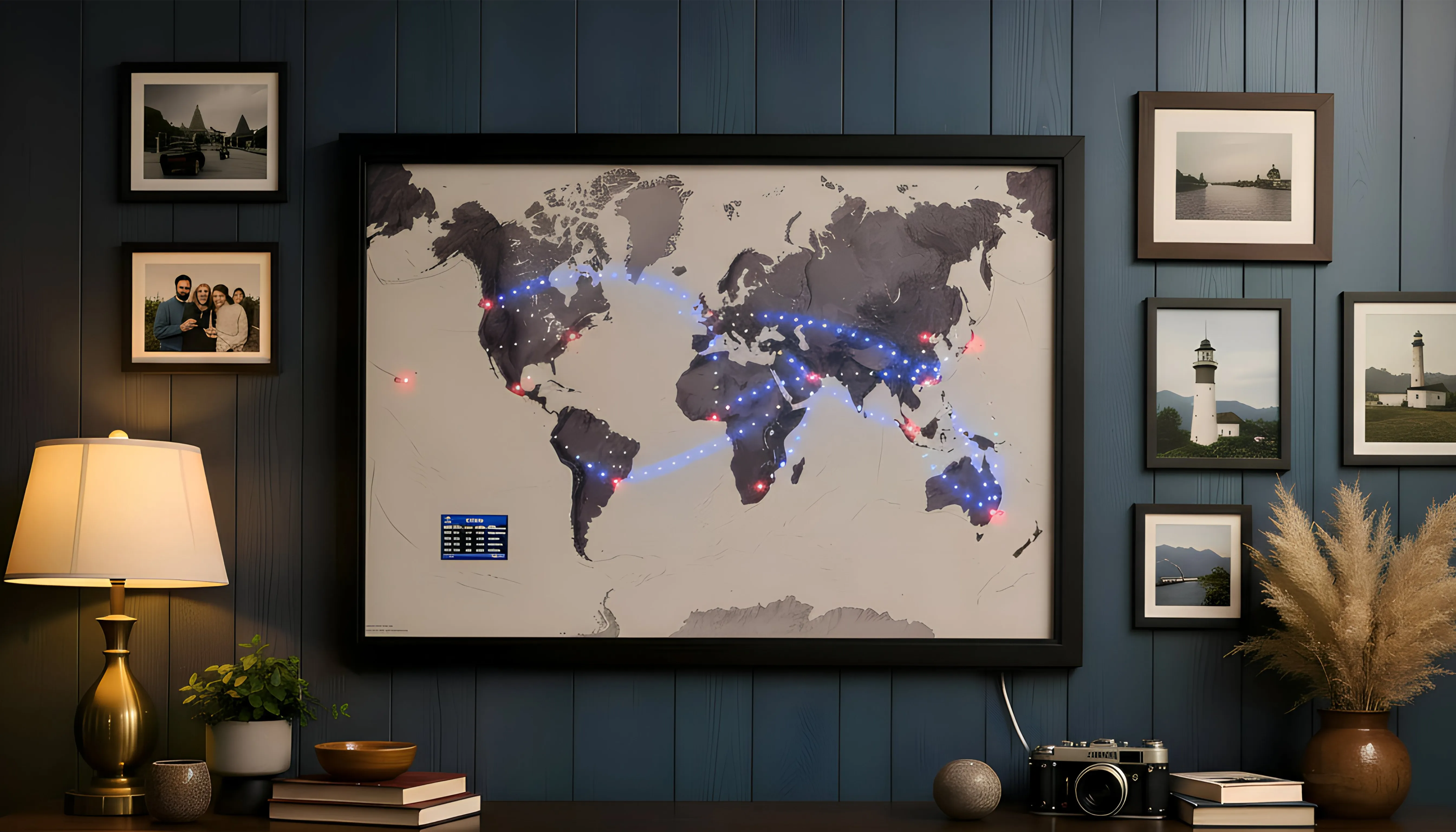 Every shortcut would show in the final product. The map is hydrographic cartography by Lovell Johns (est. 1972), printed at A1 on 320 gsm museum-grade paper by Fine Print, and framed by Isis Creative Framing. The electronics — 190 individually-addressable WS2812B LEDs on a custom PCB, driven by a bespoke Flightradar24 data pipeline — are assembled by hand in the UK. Each partner was chosen because they're the best at their craft. The result is a handmade instrument that lives on your wall.